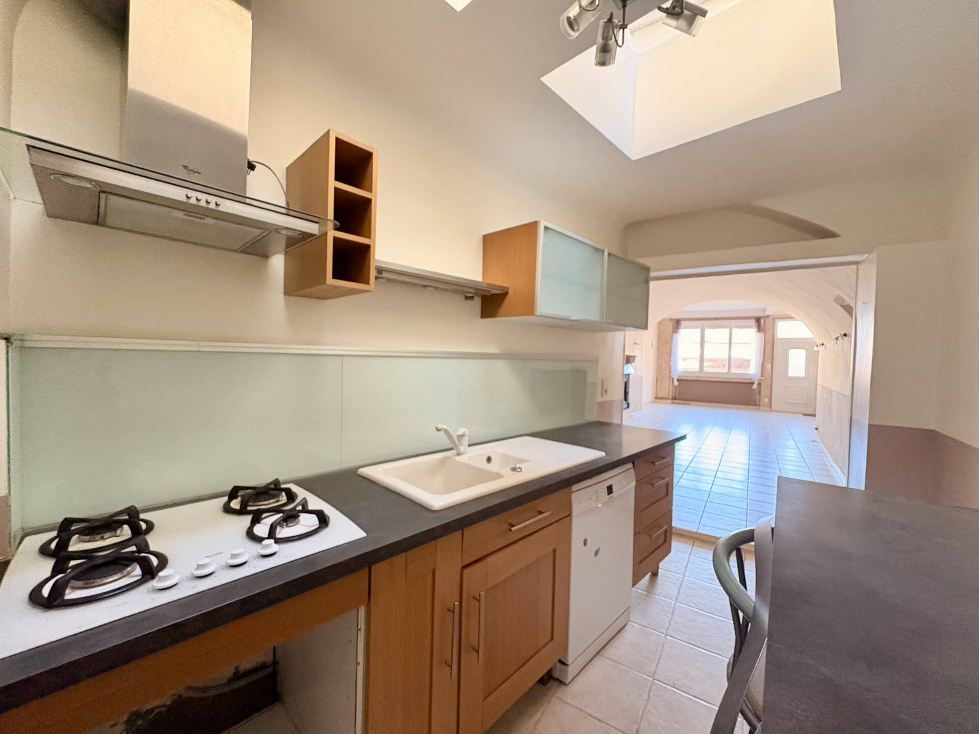 Maison d'habitation de 100m2 hab. environ et comprenant: -Rez-de-chaussée: Entrée ouverte sur grand salon/séjour de 40m2 environ, cuisine aménagée et équipée, buanderie et WC avec lave mains; -1er Etage: Deuxième entrée donnant sur véranda, dégament et couloir, deux chambres, salle d'eau avec grande douche à l'italienne et WC indépendant; -2ème Etage: Bureau dans combles avec velux. Chauffage Gaz (2024: chaudière).